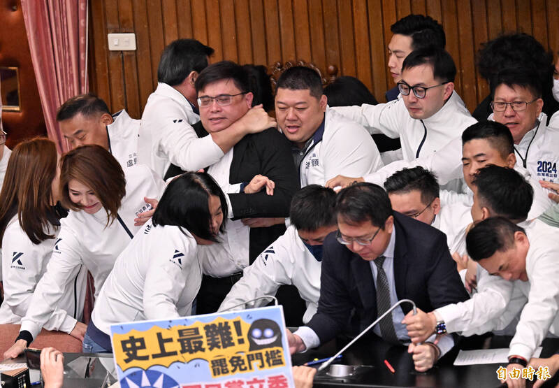 當前的台灣正處於內外夾擊的艱難處境,藍白陣營在國內政局中亂象叢生。圖為民進黨立委賴瑞隆遭國民黨黃仁架住脖子拉離主席台。 (記者劉信德攝)