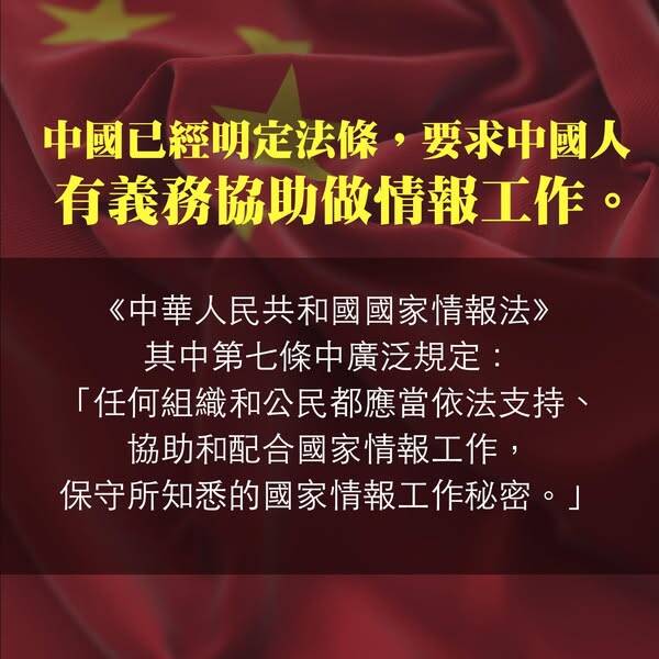 中國已經明定法條,要求中國人有義務協助做情報工作。 (取自貼文)