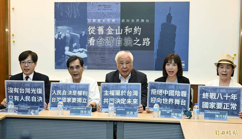 台灣教授協會副會長陳月妙(右起)、民進黨立委張雅琳、總統府資政姚嘉文、台獨聯盟主席陳南天、台灣基進黨主席王興煥等團體,呼籲正視「舊金山和約」中關於台灣主權的歷史事實。(資料照)